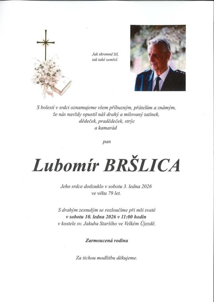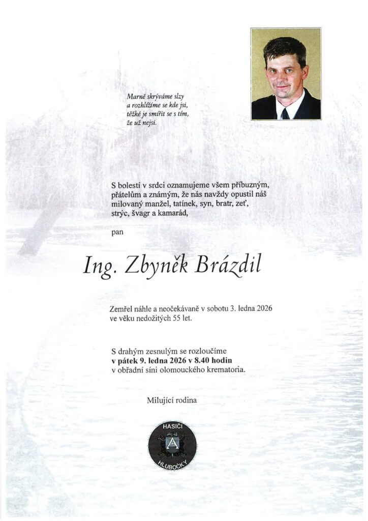 Vážení s hlubokým zármutkem Vám oznamuji, že nás opustil člen VV OSH, starosta sboru Hlubočky Ing. Zbyněk Brázdil.Poslední rozloučení se uskuteční v pátek 9.1. 2026 v 8:40 v krematoriu v Olomouci. Po obřadu proběhne smuteční hostina v kulturním domě v Hlubočkách, na který Vás rodina i hlubočtí hasiči srdečně zvou. Parte-Ing. Zbyněk Brázdil